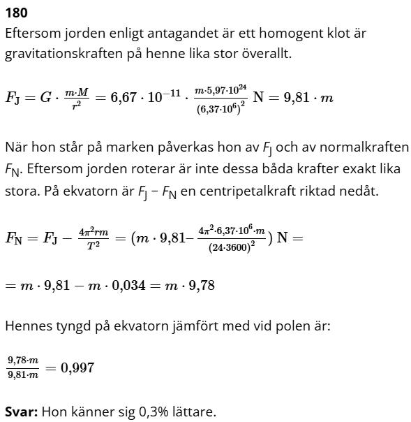För att lösa den här uppgiften så antar man att Fc=Fn-Fg, min fråga då varför man kan anta det här. Jag själv skulle tänka att när jorden börjar rotera så skulle det göra att man känner sin lättare, eftersom det skapas en kraft utåt från jordens centrum, i sådana fall borde väl Fn vara lite större? Nu kanske inte det är så rimligt eftersom det skulle göra att man börjar flyta över marken.