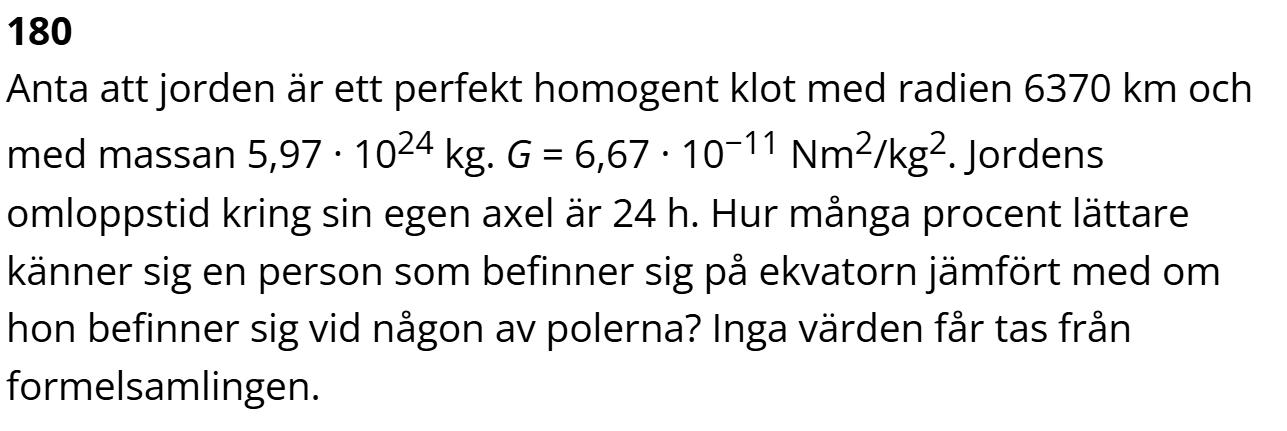180 Anta att jorden är ett perfekt homogent klot med radien 6370 km