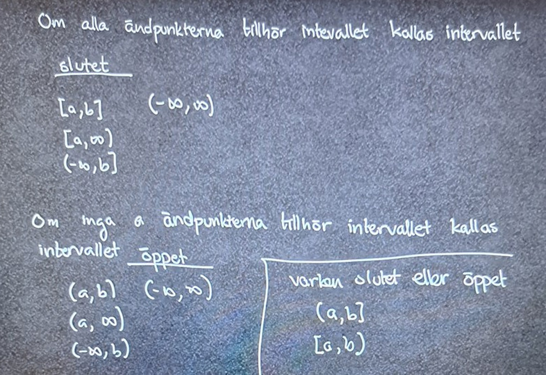 I klippet ovan förklarar läraren att (-oo,oo) är  både ett öppet och slutet intervall vilket jag inte riktigt uppfattar. Varför är det så?  Jag tänker parenteserna säger väl att intervallet är öppet. För att intervallet ska vara slutet så borde det vara hakparentes som de andra intervall. En annan sak jag undrar över är intervall som är varken öppet eller slutet , ska man bara se att det är så för att det står [a,b)?