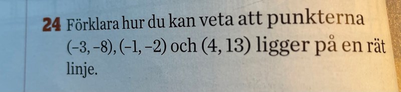 En rät linje har alltid samma lutning, dvs ska k-värdet mellan de olika punkterna vara samma. Kolla om det stämmer!