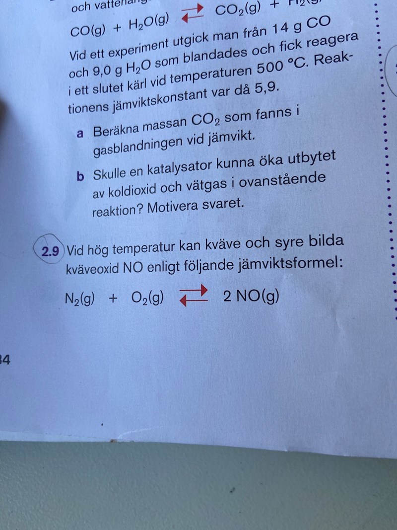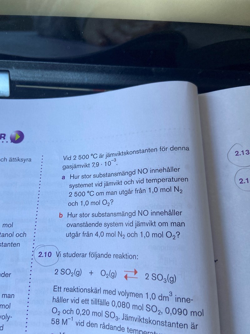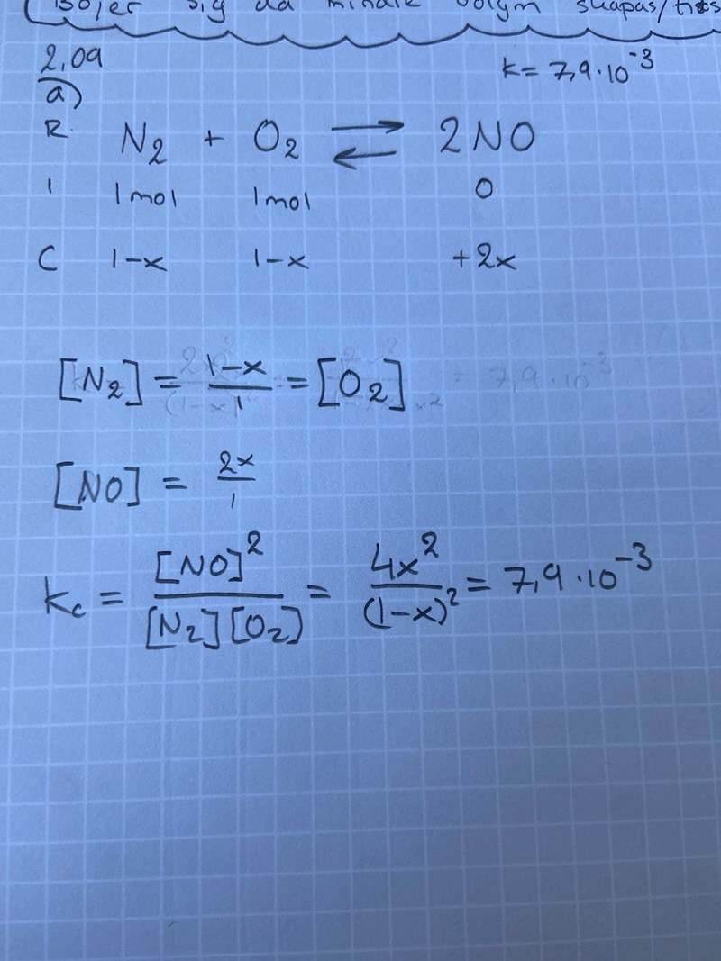 Jag ska räkna ut substansmängden för NO men har fastnat. Bifogar min ”lösning” och frågan. När jag löser x stämmer det inte med facit som säger 8,5x10^-2 mol