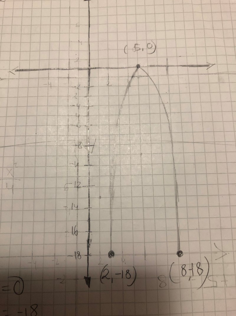 Inte världens bästa bild, men här har jag försökt göra en skiss. Tre punkter har jag prickat in. Punkt (-1,0) , (5,0) och (2,-18) . Dessa tre punkter använder jag mig av för att beräkna parabelns ekvation.