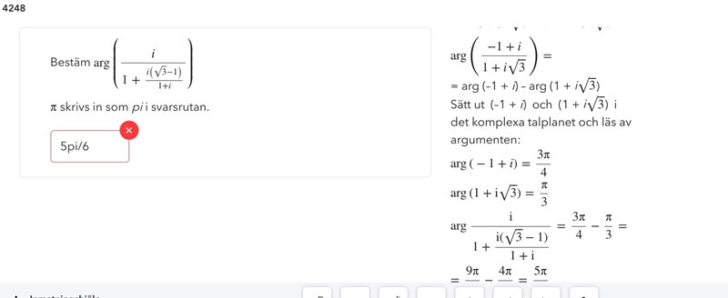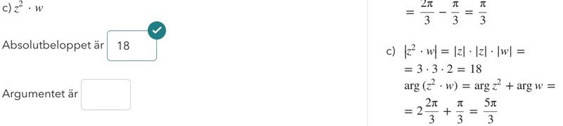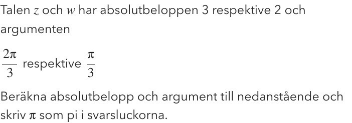 Det jag inte fattar är uppgift c) där arg z (vilket är då vinkeln) är upphöjt med 2, borde inte då 2pi/3 upphöjas med två så att vi får 4pi^2/9...varför multiplicerar de istället vinkeln med 2?