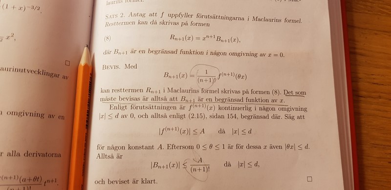 Min första fråga gäller funktionen ln( 1+x ), som dom senare maclaurin utvecklar till . Sats 2 (första bilden) antar en stängd kontinuerlig omgivning kring x = 0 vilket inte är fallet för ln( 1+x ) vid x = -1. Hur tolkar man B(x) här? Är B(x) ens giltigt i den kontinuerliga omgivningen av x = 0?