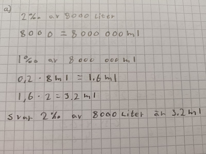 Bubo skrev:Promille betyder tusendel. Man ska beräkna två tusendelar av 8000 liter.