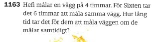 Jag tycker de här problemen blir mycket enklare om man skalar upp dem istället. 4 tim och 6 tim kan båda ökas upp till 12 timmar. Hur många väggar har de målat tillsammans på 12 timmar?
