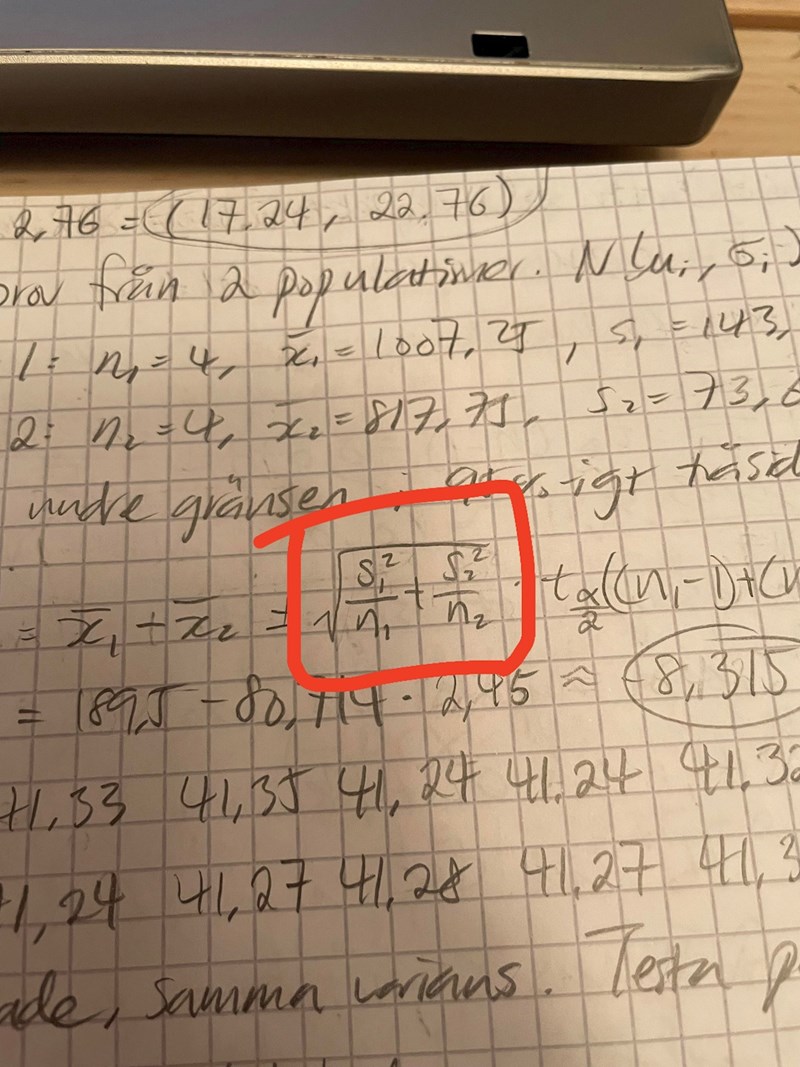 Hej! I formelblad för 2 stickprov av samma/olika varians med okänd signa så ska man räkna fram D*obs enlig följande formel(bild 1). Men jag har lyckats få fram snarlika/samma svar i vissa uppgifter med formeln i bild 2. Frågan är om de är samma sak och man kan använda den enklare versionen på bild 2 istället?