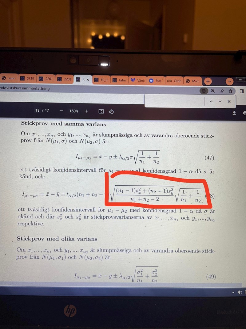 Micimacko skrev:Den första är till för att få fram ett viktat medelvärde mellan s1 och s2. De ger samma sak om båda n är lika stora, så medelvärdet inte behöver viktas, annars är det olika formler.