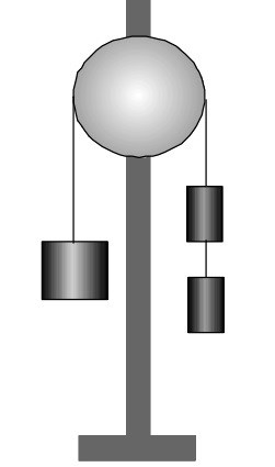 Det du kanske har gjort utan att skriva här, kanske inte tänkt på, är att sätta accelerationerna för vikterna lika. Med sträckt snöre har de samma hastighet och samma acceleration. Skriv en ekvation för att accelerationerna är lika, så är du nästan klar.