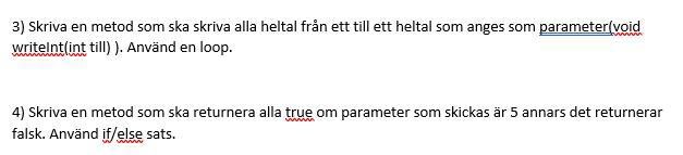 På 3an förstår jag inte riktigt hur jag ska göra. Jag har inte riktigt förstått mig på vad metoder / void innebär, och vad menas med writeInt(int till)? Snälla förklara kortfattat vad metoder betyder för mig, och hur jag ska börja uppgiften