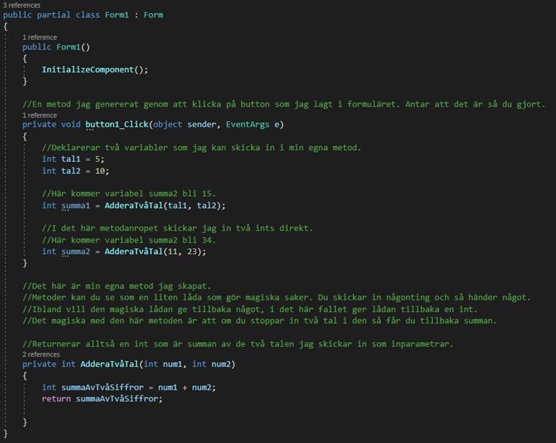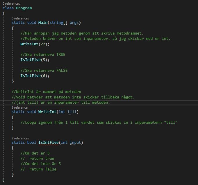 En metod är som en funktion i en klass. Det du redan har där, t.ex. btnKör_Click (svårt att läsa namnet i den bilden) är en metod. Du ska skriva en egen metod som heter writeInt. Den ska inte returnera något värde, så därför står det "void".