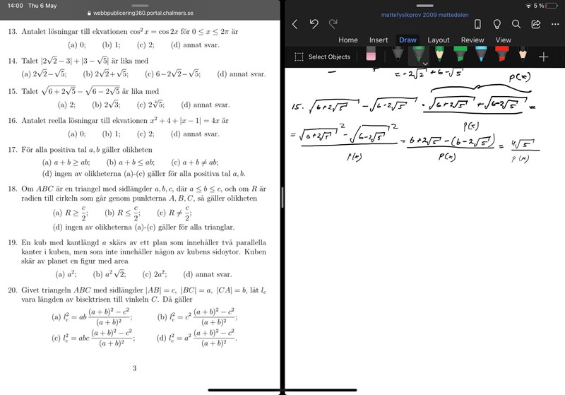 Hmm... jag förlänger med konjugatet men mitt svar finns inte med svarsalternativ. Kan se att det redan är i en slags a^2-b^2 form, där kvadraten är roten ur istället. Kan jag skriva om det till (a-b)(a+b) på något vis? I så fall hur?