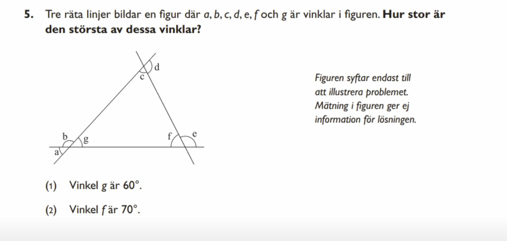 - b och g är sidovinklar, så det gäller att b+g=180°. Därmed blir b = 180° - g = 120° (Detta är dock inte den största av vinklarna i figuren)