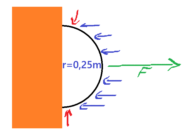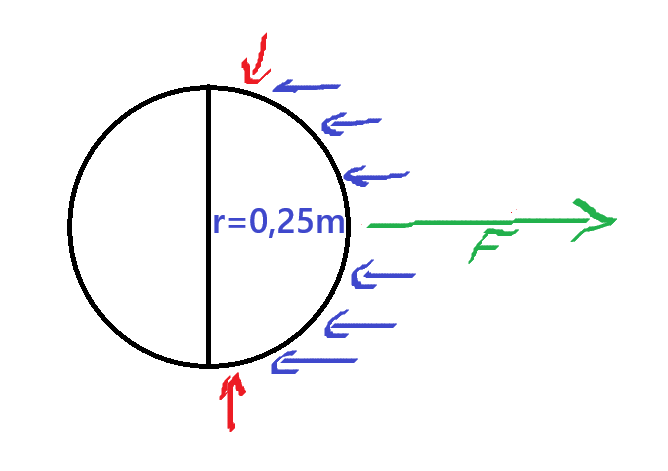 Vi har två halvklot som pressas ihop av lufttrycket (blå pilar). På de två halva sfärerna verkar ju lufttrycket i alla riktningar, men det vi behöver övervinna med våra hästar är ju enbart den kraft som är vinkelrät mot vårt gröna F. De röda som verkar åt annat håll kan vi bortse ifrån eftersom vi bara vill dra dem rakt isär.