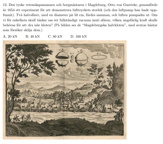 Formeln för tryck p=F/A kan skrivas om som F=pA= 1,013*10^5*0,785= 80kN. Jag svarar C men B är det korrekta enligt facit. Vad gör jag fel, varför är det B rätt?