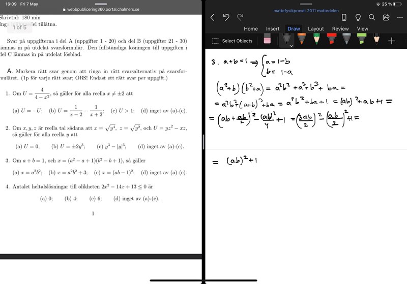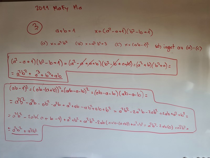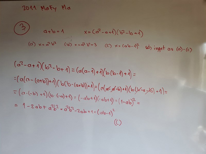 Har också problem med denna uppgiften. Jag har kommit fram till att man kan utesluta alternativ (a) och (b) genom att stoppa in olika värden för a och b som uppfyller . Nu är frågan ifall det är alternativ (c) eller (d). Alternativ (c) verkar gälla för alla värden på a och b, men det ända sättet att veta med säkerhet är väl att skriva om till ? Jag försökte utveckla båda uttrycken till ett gemensamt uttryck men lyckades inte. Här är en bild.