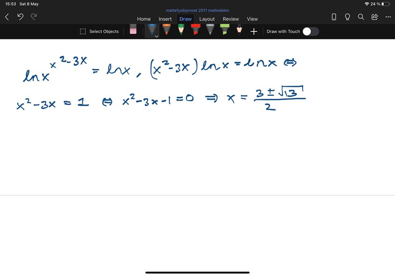 x=1x=1 är något man bara måste inse om du ska göra det med potenslagarna. hade du logaritmera hade du inte behövt fundera på det. (x2-3x)lnx=2lnxx2lnx-3xlnx-2lnx=lnx(x2-3x-2)(x^2-3x)\ln x = 2 \ln x \iff x^2 \ln x -3x \ln x - 2 \ln x = \ln x (x^2-3x-2) och här är antingen lnx=0 \ln x = 0 eller x2-3x-2=0x^2-3x-2=0. Jag föredrar att använda potenslagarna men då måste man minnas att om basen är x så är x=1 alltid en lösning.