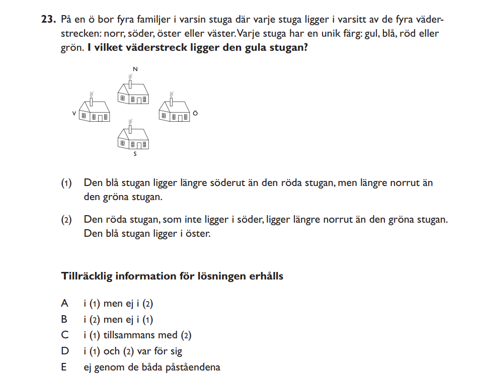 nej allstå jag utgår från just (2), det säger det står "röd ligger längre norrut än den gröna stugan", men betyder detta att röd har ett bestämd plats som N eller tolkas detta som att det ligger "längre upp", mer norr än gröna stugan. allstå kan Röd vara antingen NORR ELLER VÄST (blå är ÖST), och grön stuga kan vara VÄST ELLER SÖDER. Fattar du?