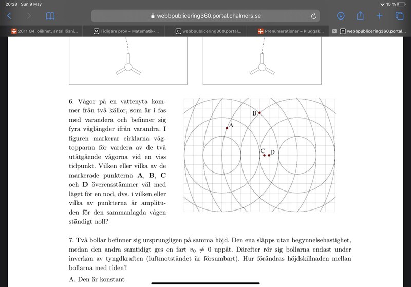 A) och C) är rätt svar, hänger inte med på varför C) är en nod. Jag tänker att avståndsskillnaden mellan resp källor till en punkt ska ha differensen 1/2våglängd*heltal. När jag räknar antal rutor från källa1 och källa2 får jag att differensen är 1våglängd (en ruta är en våglängd), och då är det ju en buk :)