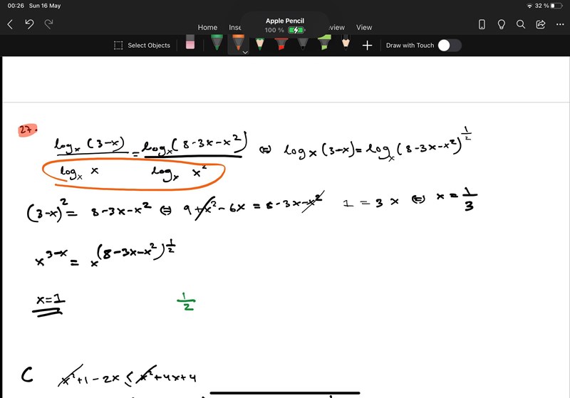 Jag försökte hitta en gemensam bas genom att kolla på deras minsta gemensamma faktor, kom fram till att det var x och skrev om ekvationen. Fick ut att x=1/3 och mindes samtidigt att ifall det är x som bas så är x=1 alltid en lösning, 1/3<1 så jag svarade x=1... men rätt svar var x=1/2, varför blev det fel?
