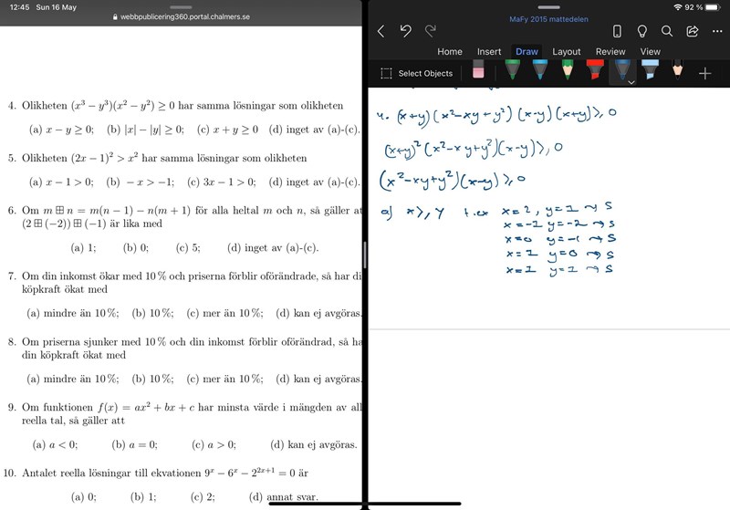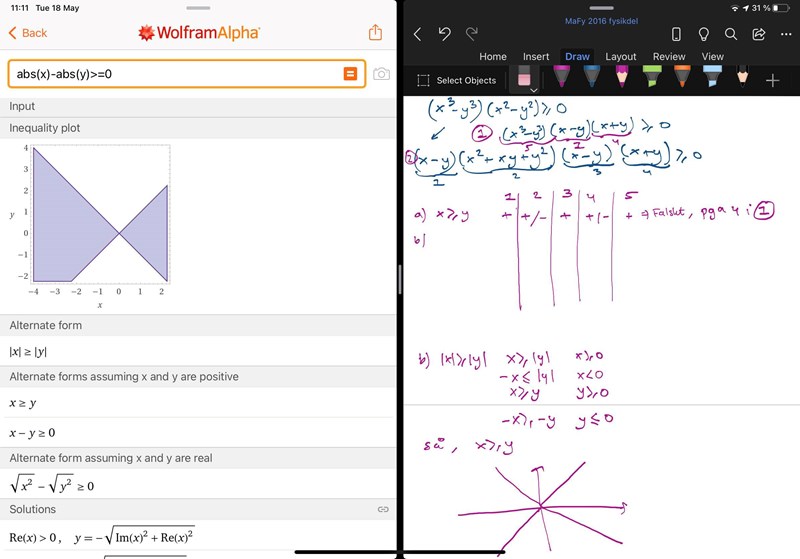 Smaragdalena skrev:Den första olikheten är sann om de båda parenteserna har samma tecken. Jag skulle rita upp ett koordinatsystem för varje parentes och markera de områden där x3-y3 respektive x2-y2 är positiva/negativa. Sedan skulle jag rita ett koordinatsystem till och markera de område där de båda parenteserna har samma tecken. Förhoppningsvis skulle det vara tillräckligt för att kunna avgöra vilket alternativ som är rätt.