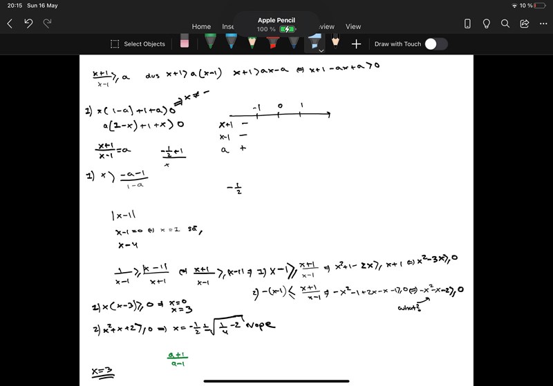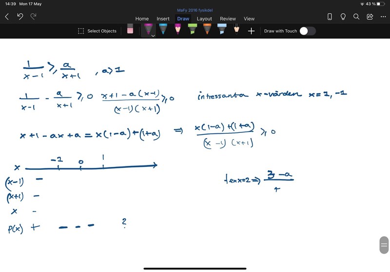 Jag försökte med dina tips, men förstår ändå inte hur jag ska hitta största möjliga lösning? När x>1 så är verkar det inte möjligt att veta ifall uttrycket blir positivt eller negativt, utan att veta a mer exakt. Förstår inte hur man har fått a i nämnaren i svaret... allt med uppgiften känns förvirrande just nu :p