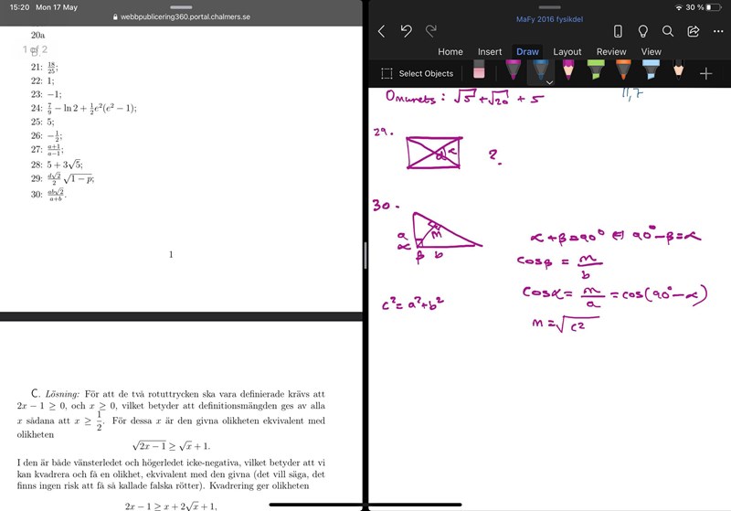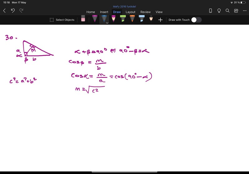 Du kan också beräkna totala arean vilket blir ab/2 och sedan beräkna arean av kvadraten och de 2 deltrianglarna och sedan sätta dem lika. Sedan har du sambandet att