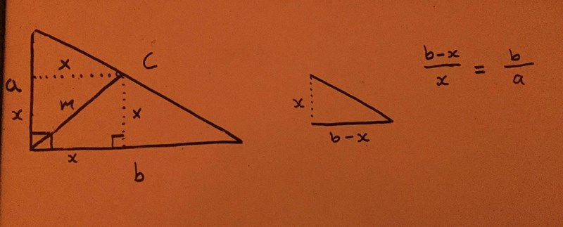 Men vad man kan köra är att skapa en kvadrat inuti triangeln vars diagonal är bisektrislinjen. Kalla sidorna av den kvadraten x exempelvis. Den nya rätvinkliga triangeln som skapas till höger av kvadraten är likformig till den stora triangeln som vi började med, det betyder att förhållandet mellan sidorna måste vara lika, ställer man upp det förhållandet och löser för x så kan man sedan veta vad längden av bisektrislinjen är med hjälp av pythagoras sats, då vi vet x.