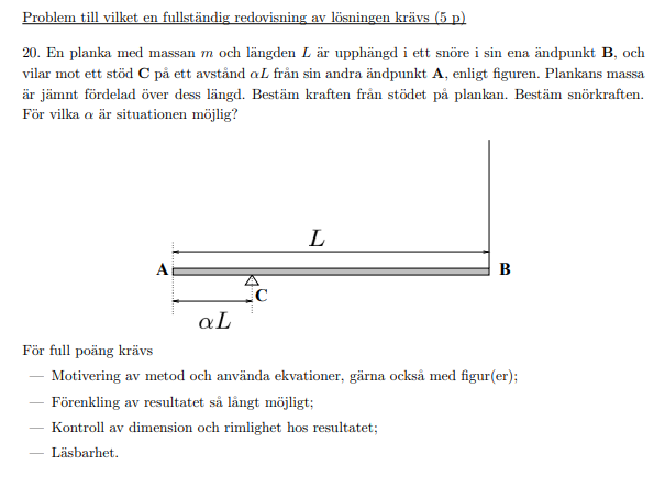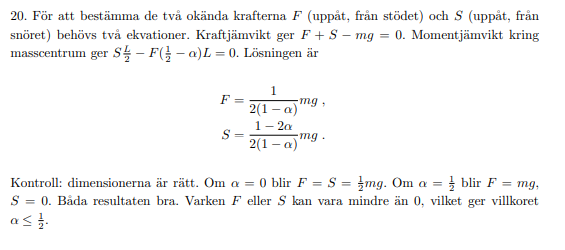 Sedan i facits svar så har de alltid med "≤" symbolen istället för < eller =, vilket jag förstår ibland när det är tydligt varför. Men i detta fall förstår jag ej. Eftersom ifall svaret blir α ≤ 1/2 då kan ju nämnaren blir noll vilket gör att krafterna blir odefinierade. Jag fick 1/2>α, hur mycket avdrag skulle det ge om det nu är fel?