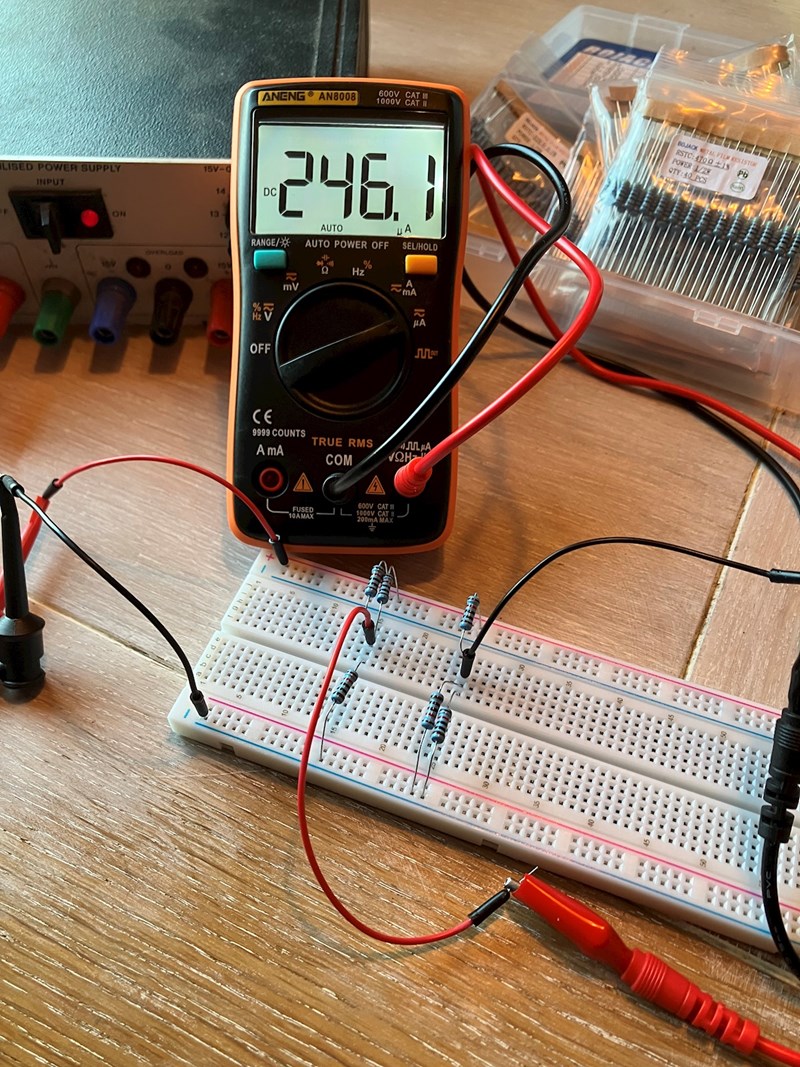 När jag ändå var igång passade jag på att koppla upp Pieters krets. Föga förvånande är strömmen genom AB 750 uA (ungefär).