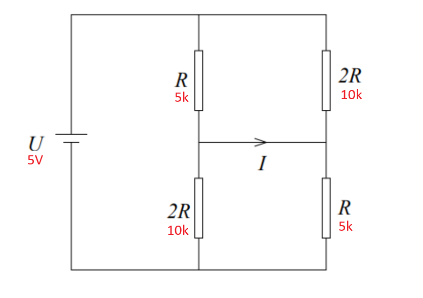 Den här bryggan är inte balanserad, men man ska se en annan symmetri, att det blir en spänningsdelare 1 : 1 eftersom båda par av de parallellkopplade motstånden har samma ersättningsvärde. Så det blir samma spänning U/2 över varje av dessa fyra motstånd i kretsen. Så kan man snabbt räkna ut alla strömmar i kretsen.