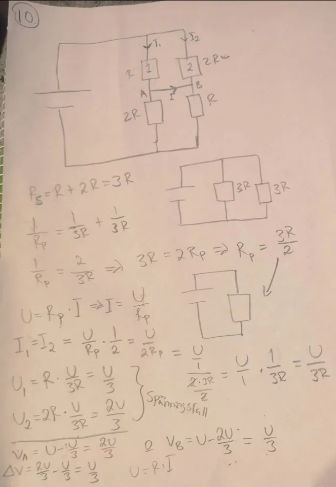 I alla fall, jag tror jag förstår typ sin beräkning. Däremot förstår jag inte varför båda första motstånden får U/2, vad jag vet så får väl båda motstånd grenar en total spänning på U. Varför skulle spänningen delas exakt lika, mellan två seriekopplade resistorer med olika motstånd? Är det kanske för att strömmen genom andra motståndet inte är samma som genom det första pga den förgrening som sker i mitten?