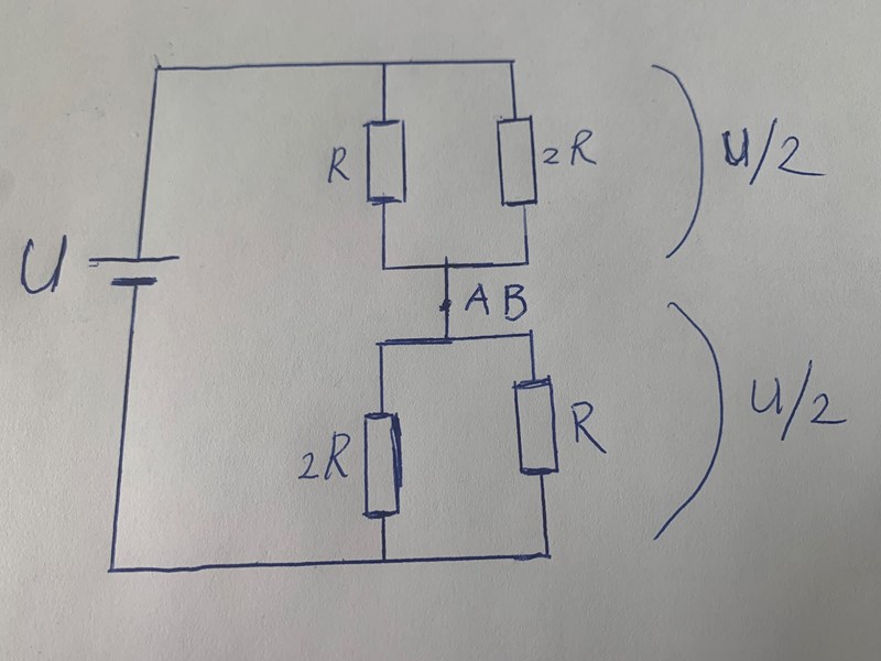 Så det blir samma motstånd på båda sidor av AB. Det är U/2 över båda sidor.