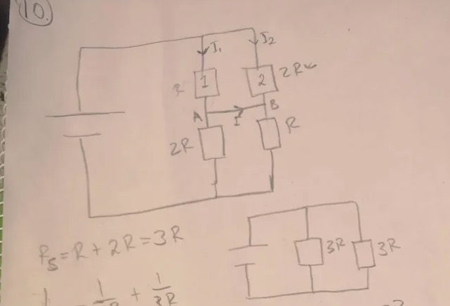 Tanke 2, är att efter första resistorn i vardera gren, så är spänningsfallet olika eftersom det är olika resistans, därmed ges en potentialskillnad som bör driva en ström. Detta motsäger ju det jag skrev i min första tanke att strömmen är 0.