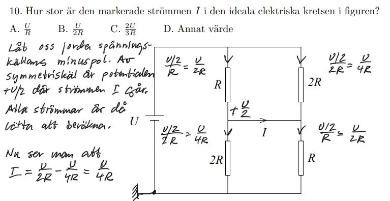 Jag har nu läst om Wheatstones bryggan och det är som Pieter skriver, den är inte balanserad. Så mer av den teorin kommer inte ta mig till svaret. Däremot så är det en symmetri, vilket jag inte är helt säker på vad det innebär. Men vad jag tolkat det som, är att det är lika stor ersättningsresistans i båda grenar, vilket i så fall skulle ge samma ström i båda grenar och därmed kan det inte finnas en ström som fylls på från ena grenen till den andra i mitten. Dock så om man utgår från teorin om Wheatstones bryggan, så blir det en potentialskillnad efter motstånd 1 i respektive gren som i så fall borde ge en ström. Så på sätt o vis går dessa två argument mot varandra, samtidigt som det inte finns ett alternativ med I=0 (vilket kanske D räknas som). Hur skulle ni resonera kring dessa motsägelser?