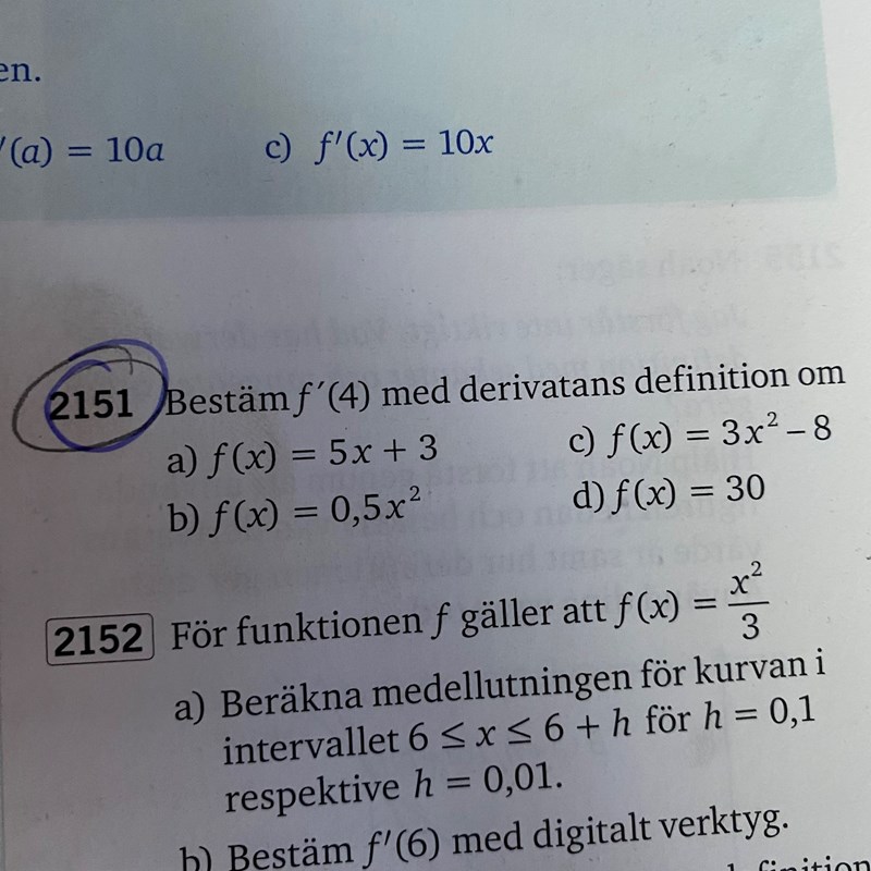 Du skall ta två punkter på kurvan y=f(x). Den ena skall ha x-värdet 4, den andra punkten skall vara "nära" den första punkten. Vi skulle kunna välja x=4.00001, men säg att vi väljer x=4+h, där h är mycket litet.
