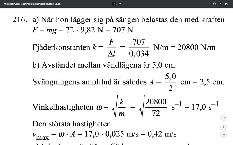 b) När Dina kastar sig platt i sängen kommer den i gungning. Avståndet mellan vändlägena är 5,0 cm. Vilken är den högsta hastighet som Dina får när hon gungar upp och ner?