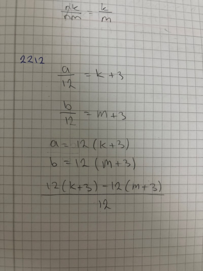 Låt a och b vara två olika heltal som vid division med tolv ger resten tre. Visa att a - b är delbart med tolv.