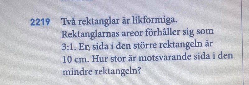 Nu har du räknat med att längdskalan är 3:1. Men det är areaskalan som är 3:1, vilket medför att längdskalan blir . :)