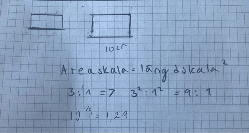 Edit: Dessutom, om skalan är 5:1 och du har en sida som är 10 cm i den stora figuren, är den lilla sidan 10 cm * skalningen, inte upphöjt till. :)