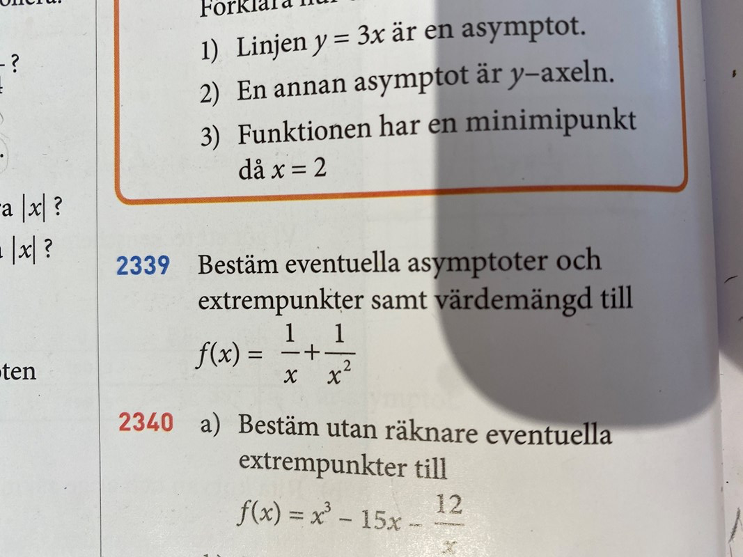 Hej! Jag får att den har en sne asymptot vid -2x och en lodrätt x= 0. Den snea är fel och fattar inte varför. En sne asymptot kan skrivas y=kx+m där k är funktionens derivata när den går mot 0 och sedan beräknar man (f(x) - (kx+m)) går mot plus minus oändligheten för att hitta m värdet. Sedan sätter man detta lika med noll. Jag får fel och fattar inte Vrf