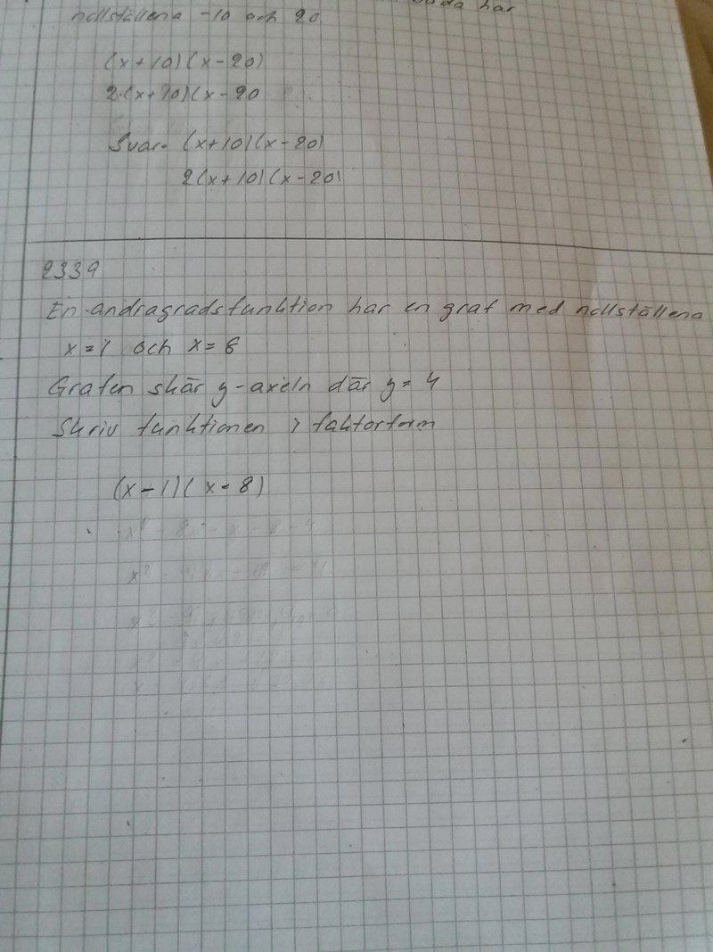 Jag skulle skriva y(x) = k(x-1)(x-8) 4 = y(0) = k(0-1)(0-8) => 4 = 8k => k = ½.
