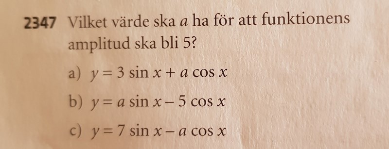 Hej, en liten fråga angående följande uppgift: Vilket värde ska a ha för att funktionens amplitud ska bli 5?