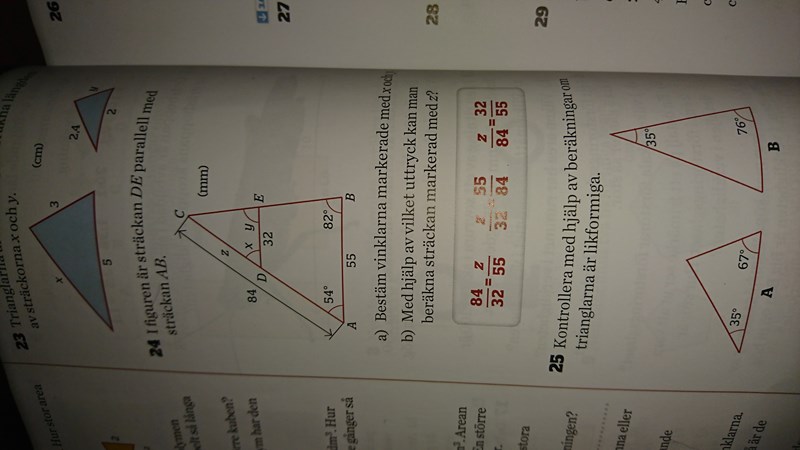 Smutstvätt skrev :Eftersom trianglarnas alla vinklar är identiska är trianglarna likformiga. Sträckan z förhåller sig till en annan sträcka på ett visst sätt. Det finns två sätt: