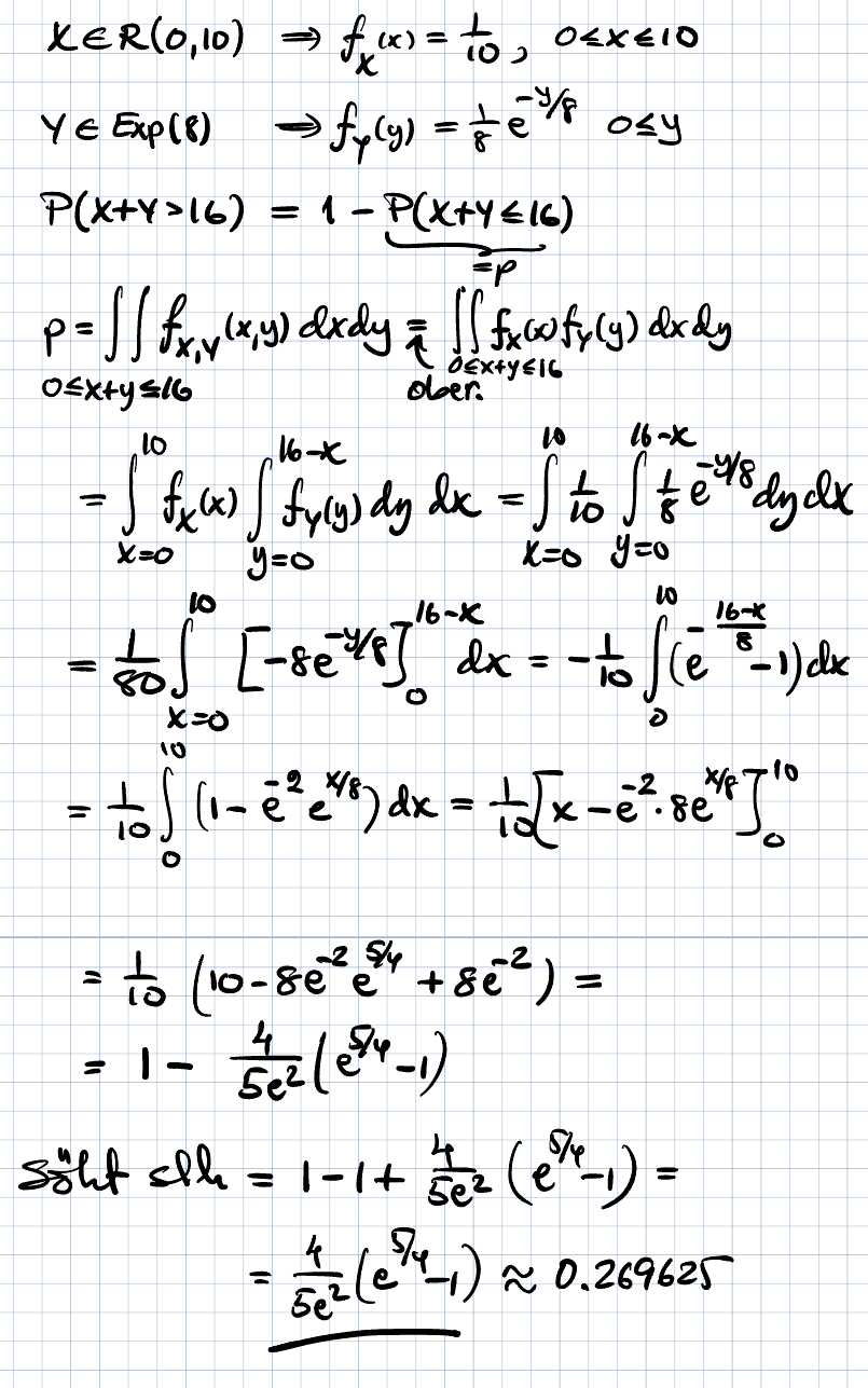 För att komma från ett ställe till ett annat åker en person först buss, därefter taxi. Om X och Y betecknar de tider som han får vänta (i minuter) på bussen respektive taxin, så är X rektangelfördelad i intervallet (0,10) medan fY(y)=1/8 * e-y/8, då y är större eller lika med 0. X och Y är oberoende. Beräkna sannolikheten för att han får vänta mer än 16 minuter sammanlagt.
