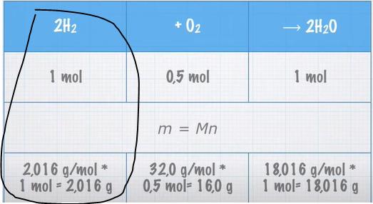 Tabellen innebär att du har en mol vätgas, tvåan framför H2 ska du ignorera. Den finns bara där för att balansera reaktionsformeln.