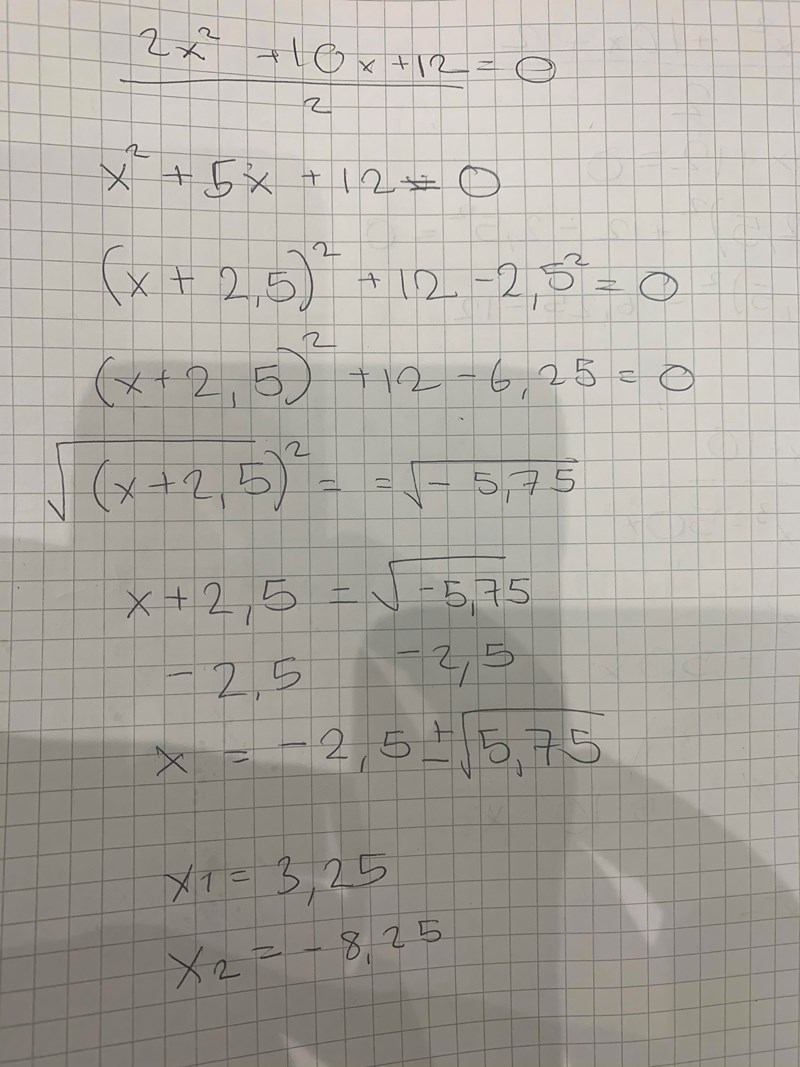 jag har delat alla termer med 2 och fick då x^2+5x+6 den använde jag kvadratkomplettering men det blir fel?