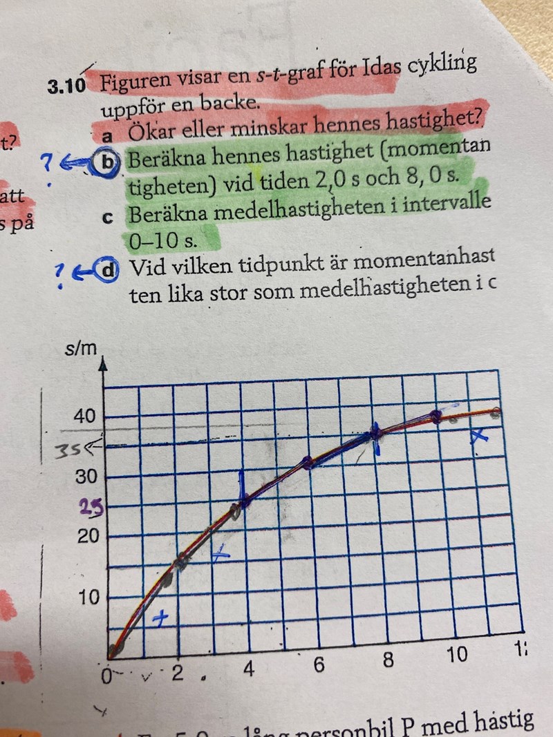 Yngve skrev:Hastigheten vid en viss tidpunkt är lika med lutningen på s/t-grafen vid just den tidpunkten.