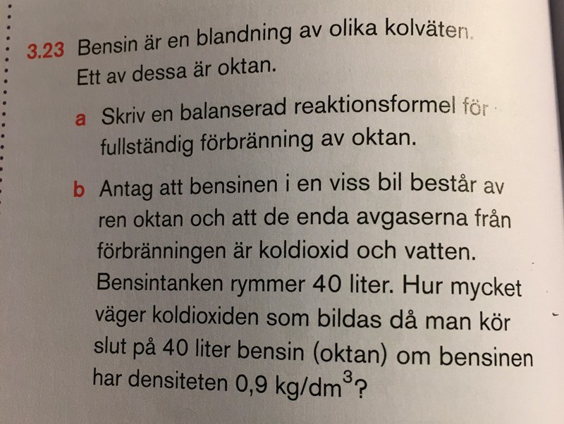 På B) räknade jag ut Massa(oktan)=40*0,9=36kg och sedan Molmassan(oktan)= 2*(8*12+18*1,01)=228,36 g/mol. Därav räknade jag ut substansmängden=massa/molmassa=36/228,36=0,15765 mol (oktan)