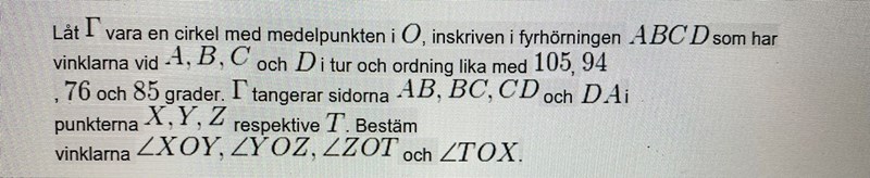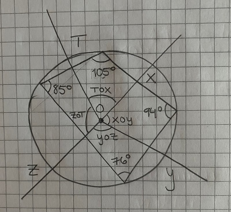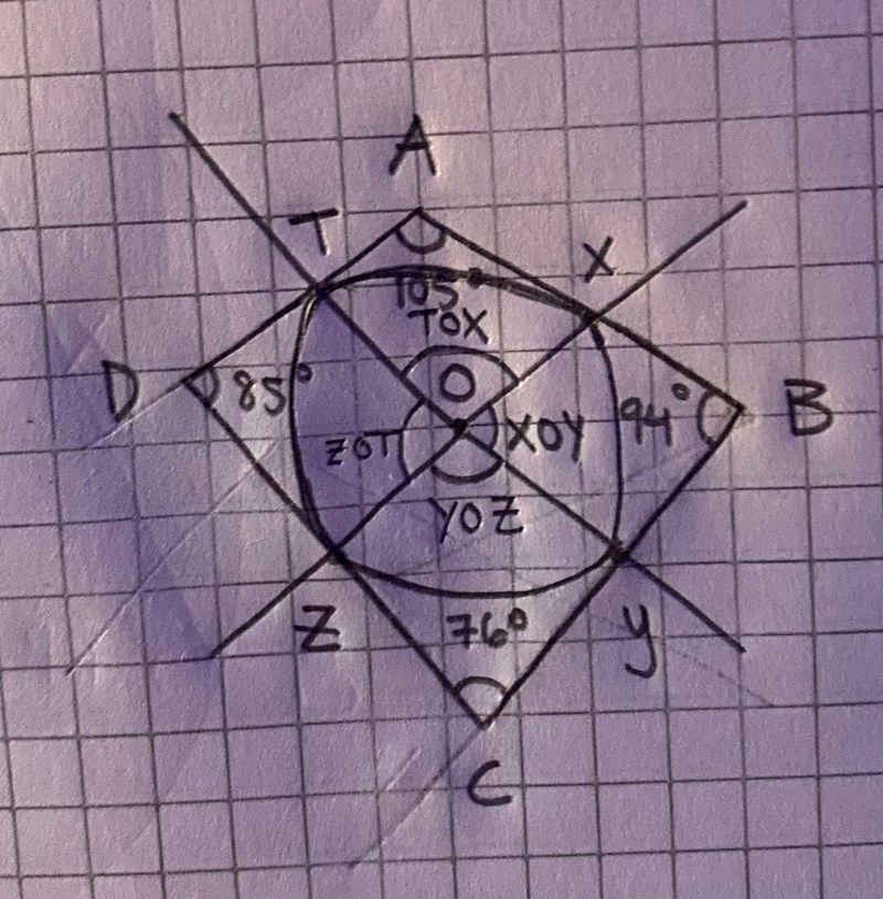 Kan man använda randvinkelsatsen och sätta att TOX + 105 = 180 grader och sedan samma sak på resterande vinklat och deras motstående vinkel i fyrhörningen eller blir det fel?